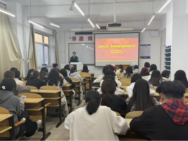 宣讲会上,段捷围绕西部计划核心政策,进行了全面、细致的解读与宣讲。从项目定位、八大服务专项的具体内容,到报名条件的详细说明,讲解条理清晰、重点突出;针对同学们最为关心的考研加分、定向考公、学费代偿、生活补贴、保留应届生身份等系列支持政策,逐一阐释,让每一位参会同学都能清晰掌握政策细节、明确自身权益。同时,她还详细梳理了报名时间节点与全流程步骤,耐心解答了同学们可能存在的疑问,确保政策宣讲入脑入心,让同学们对西部计划有了更全面、更深刻的认知。